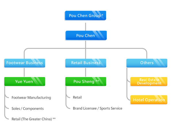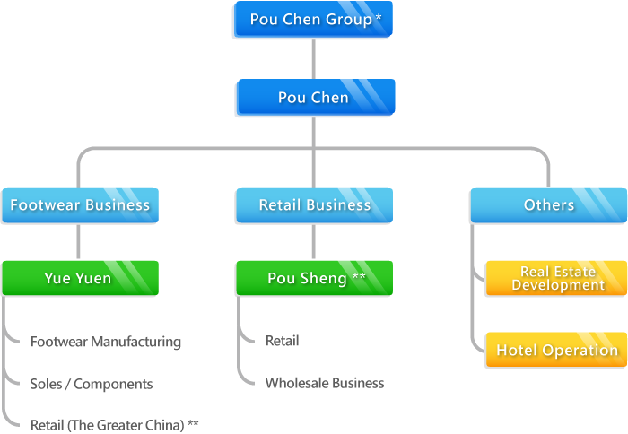 * Pou Chen Group” is not an official legal entity. ** Pou Chen via Yue Yuen indirectly invested Pou Sheng to operate retail business.